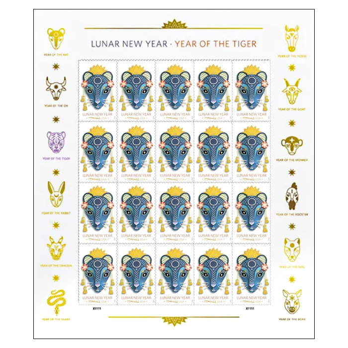 Lunar New Year is the most important holiday of the year for many Asian communities around the world. Across these varied cultures, many traditions exist for ringing in a new year of good luck and prosperity. In communities across the United States, people shop for food and other supplies, hang decorations and ceremoniously clean their homes and streets to welcome the year with a fresh start. The rat is the first of the 12 zodiac animal signs associated with the Chinese lunar calendar. Those born during the Year of the Rat may be seen as very clever, self-aware and highly social. The Year of the Rat begins Jan. 25, 2020, and ends Feb. 11, 2021. With blue as the predominant color — said to be one of the lucky colors for individuals born during the Year of the Rat — the rat mask in the stamp design incorporates elements with symbolic meaning. Several of the patterns were created with the style of Asian textiles and the circle in the center of the rat’s head represents the new moon on which the Lunar New Year begins. A pop of the very lucky color red ties the design in with other common celebratory decorations. Art director Antonio Alcalá designed the stamp with original artwork by Camille Chew. The Year of the Rat stamp is the first stamp in the third series of celebrating Lunar New Year. The first series ran from 1992 to 2005 and the second series from 2008 to 2019. The Year of the Rat stamp is being sold in panes of 20. This Forever stamp will always be equal in value to the current First-Class Mail 1-ounce price.
