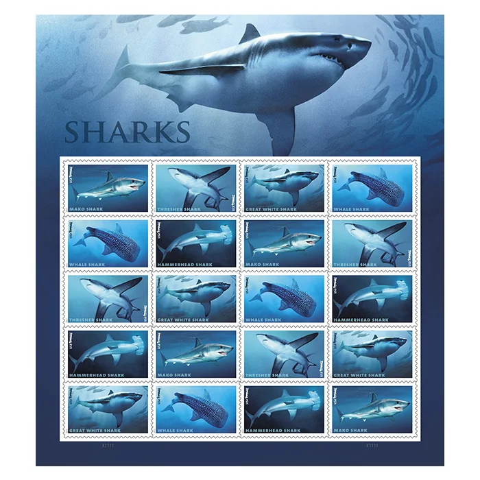 ![]() ![]() | The Sharks Forever stamps featuring five species that inhabit American waters — the mako, thresher, great white, hammerhead and whale sharks. Please share the news on social media using the hashtag #SharksStamps.